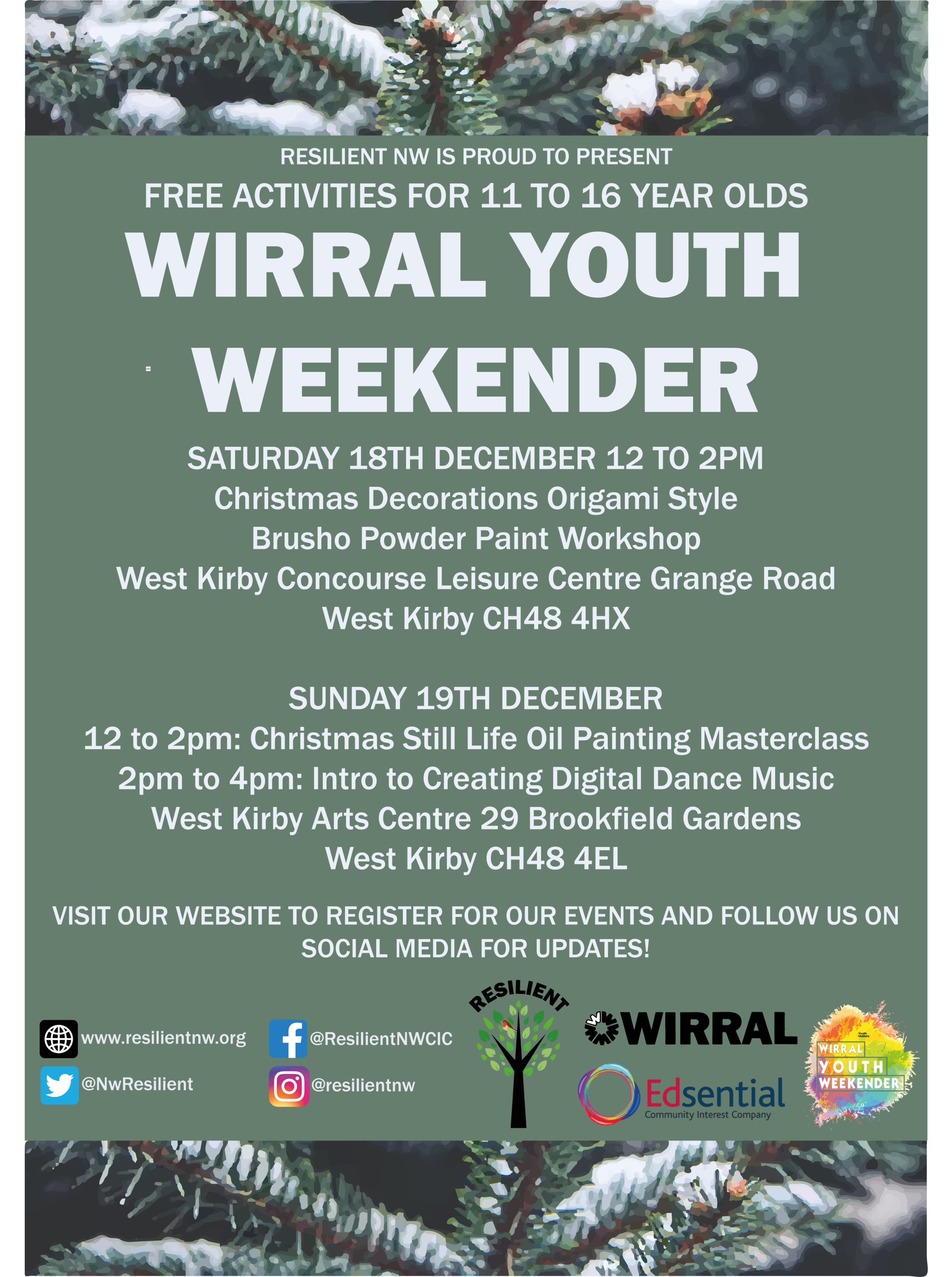 Resilient NW CIC have brought together an amazing collection of professional artists for our next Wirral Youth Weekender on Saturday 18th and Sunday 19th December.
